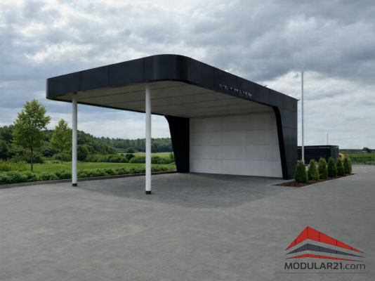 Der Carport wurde in einer modernen, minimalistischen Form mit einer individuell gestalteten Fassade entworfen, die der Konstruktion einen Premium-Charakter verleiht und sie von den auf dem Markt erhältlichen Standardlösungen abhebt. Die Form ist schlicht, elegant und architektonisch auf die Umgebung abgestimmt.
