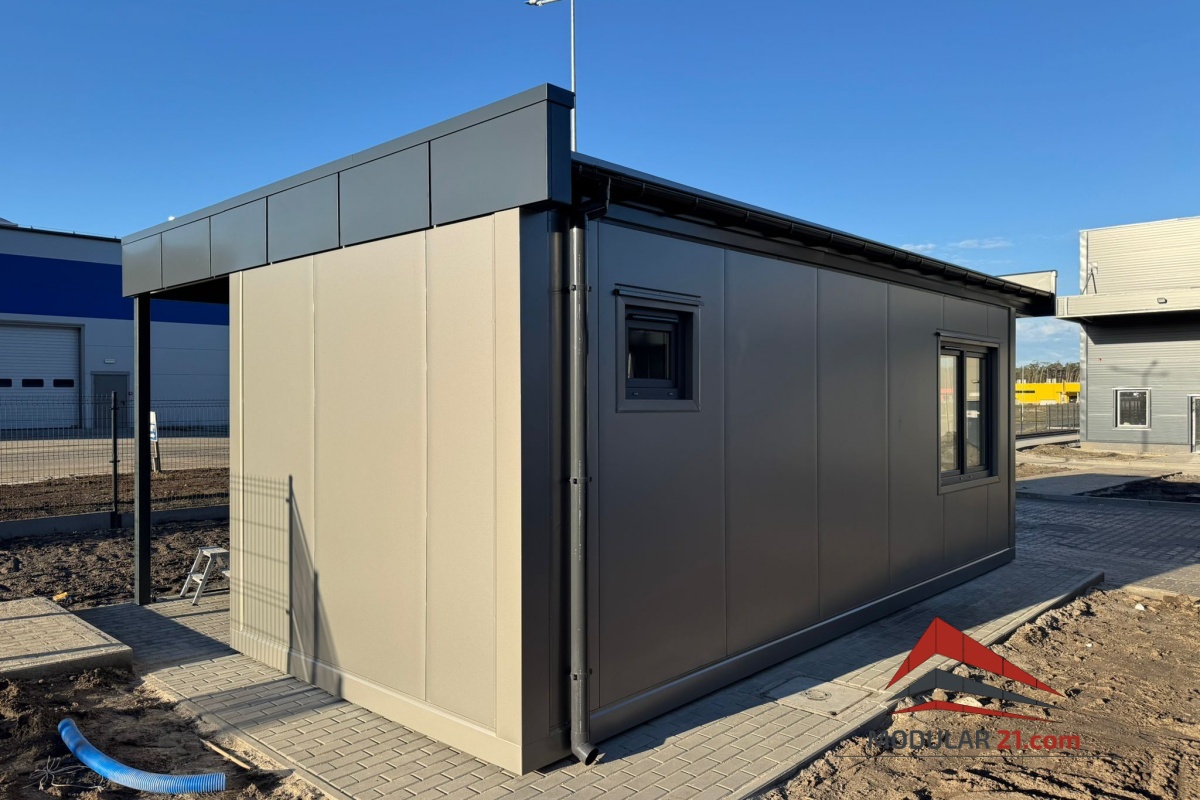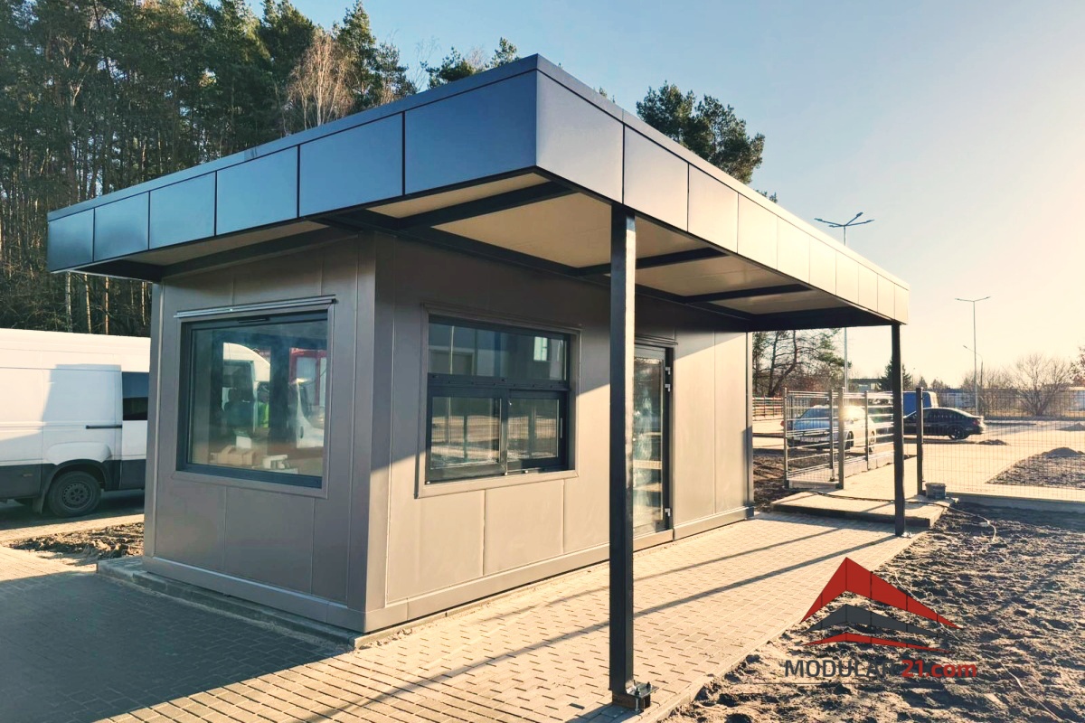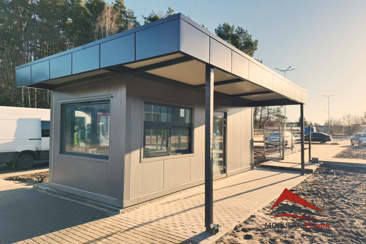 Wir haben ein umfassendes Projekt realisiert, das den Bau, die Lieferung und die Montage einer modularen Pförtnerloge mit den Abmessungen 7,00 × 3,00 m sowie einer großflächigen Überdachung von 7,80 × 5,50 m für den Generalunternehmer ADAMIETZ umfasste – eines der führenden und größten Bauunternehmen in Polen.