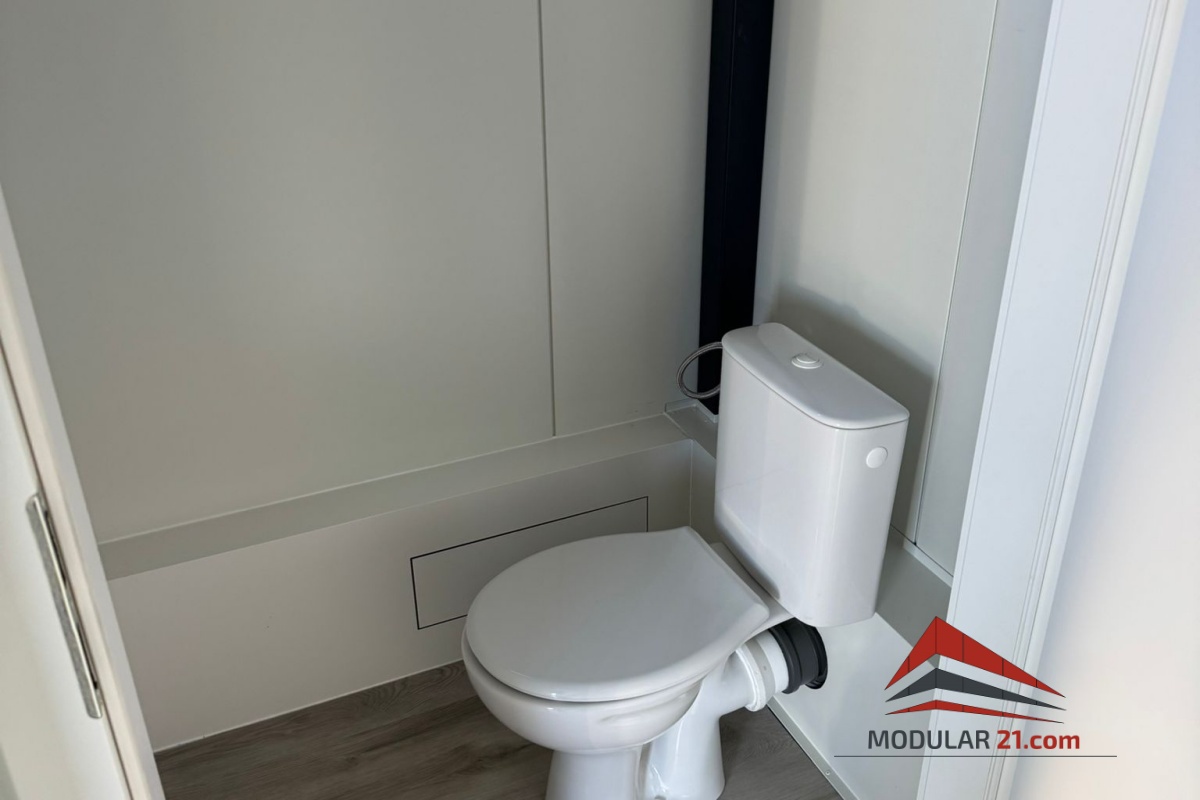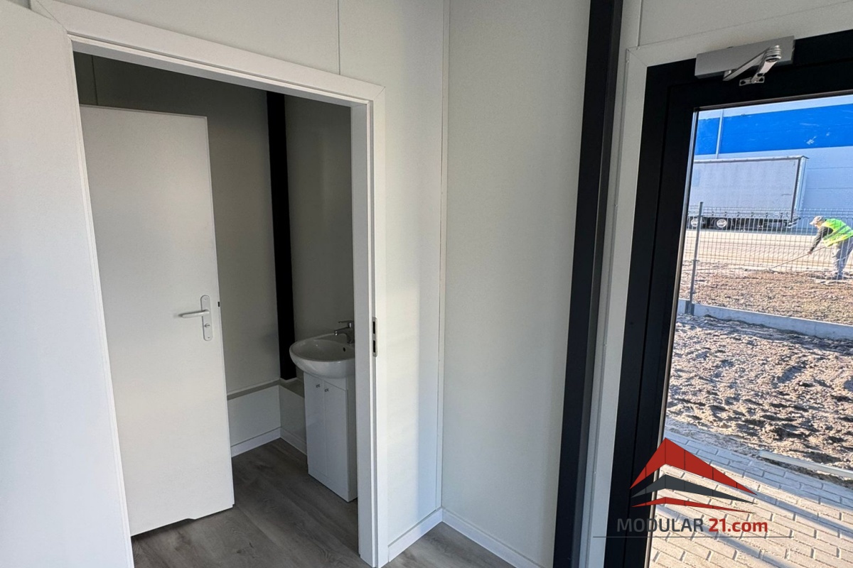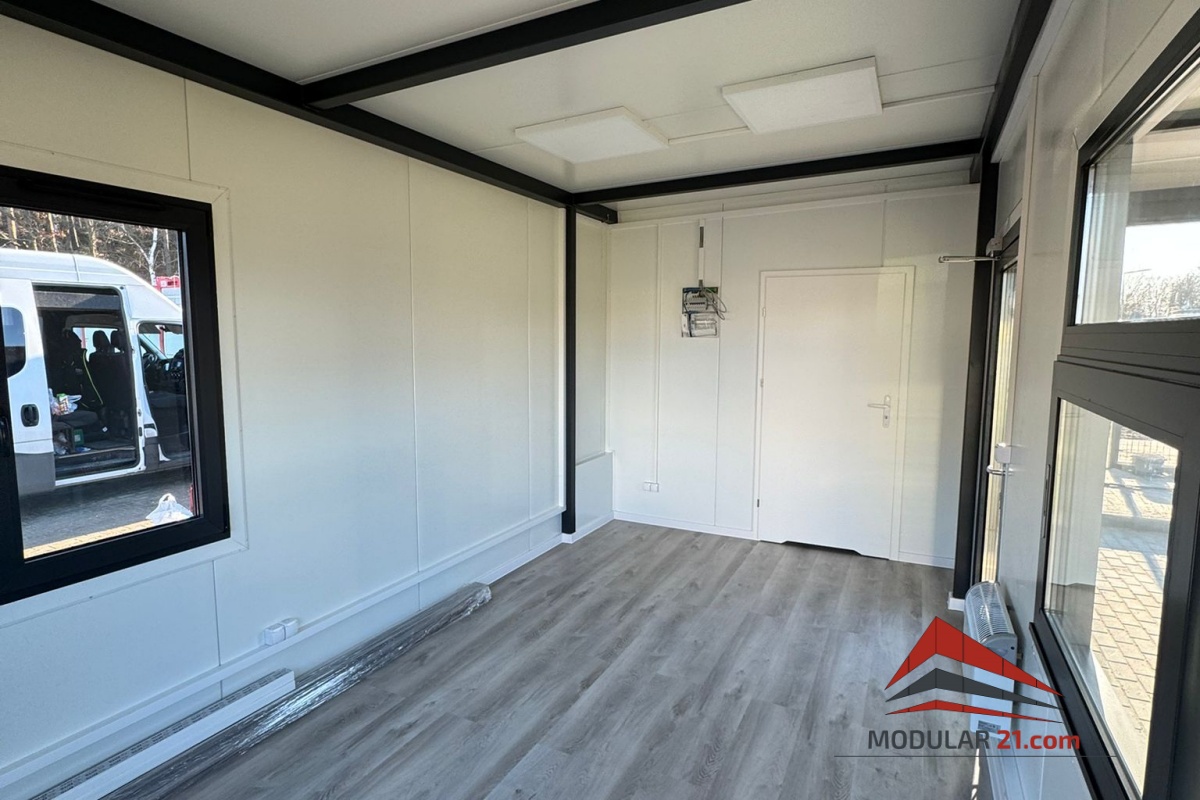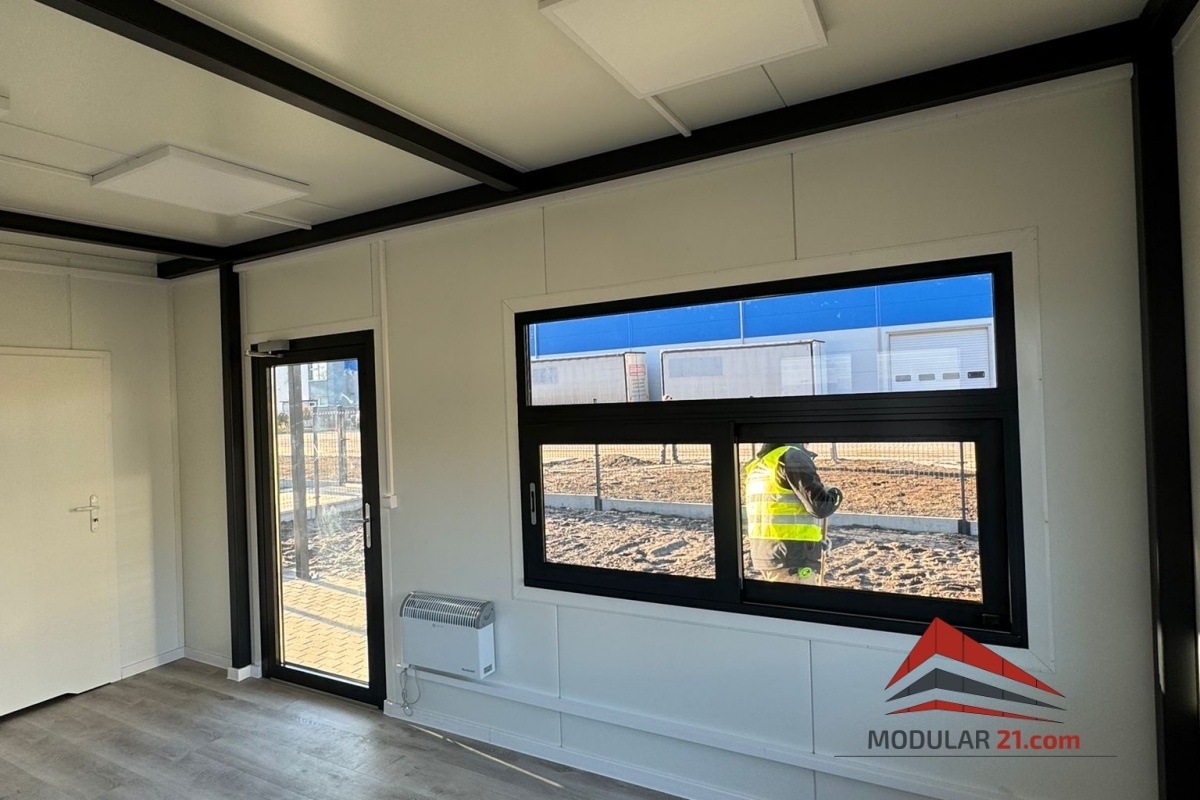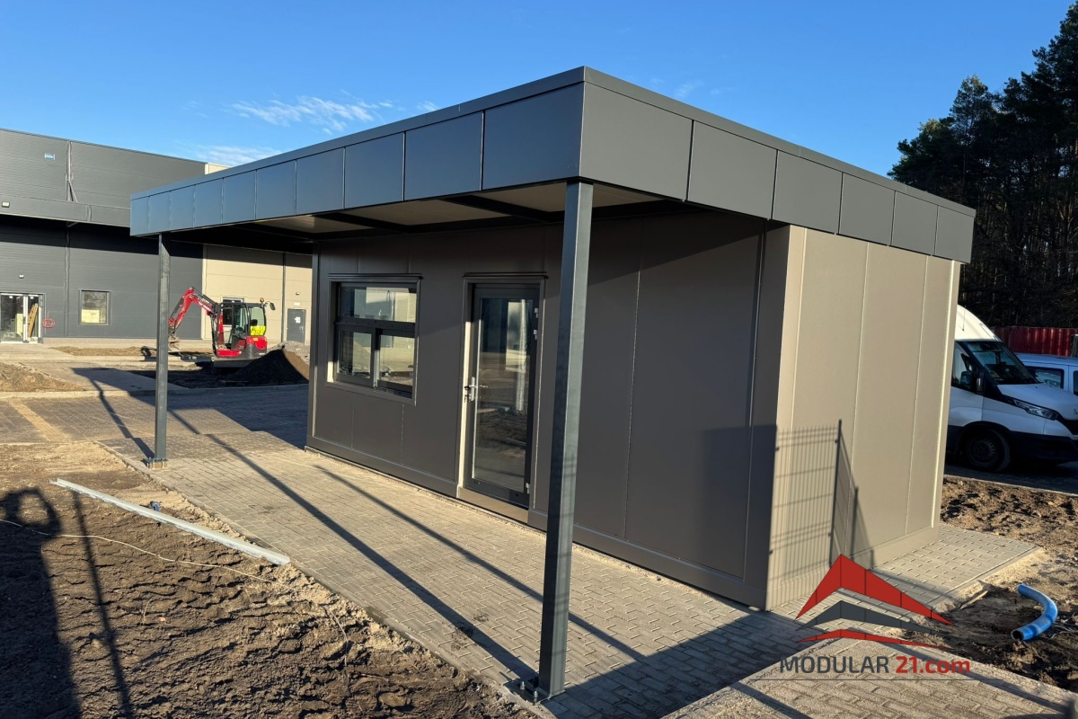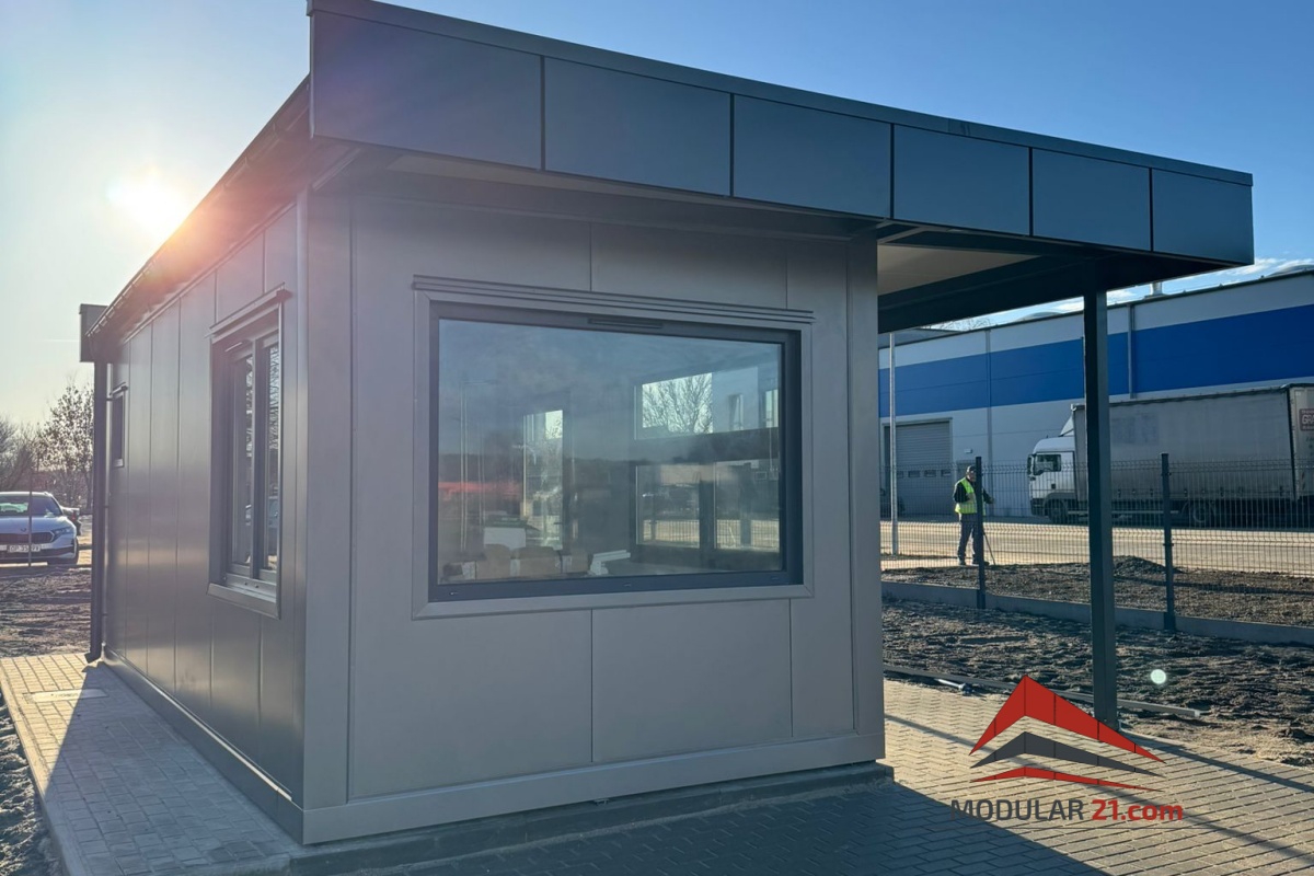 Die Pförtnerloge wurde vollständig an die individuellen Anforderungen des Auftraggebers angepasst und stellt ein modernes, funktionales Modulgebäude mit mehreren Sonderlösungen dar. Ein zentrales Element des Projekts ist die großzügige Überdachung, die den Eingangs- und Durchgangsbereich schützt und den Arbeitskomfort des Sicherheitspersonals sowie der Besucher bei jeder Witterung deutlich erhöht.