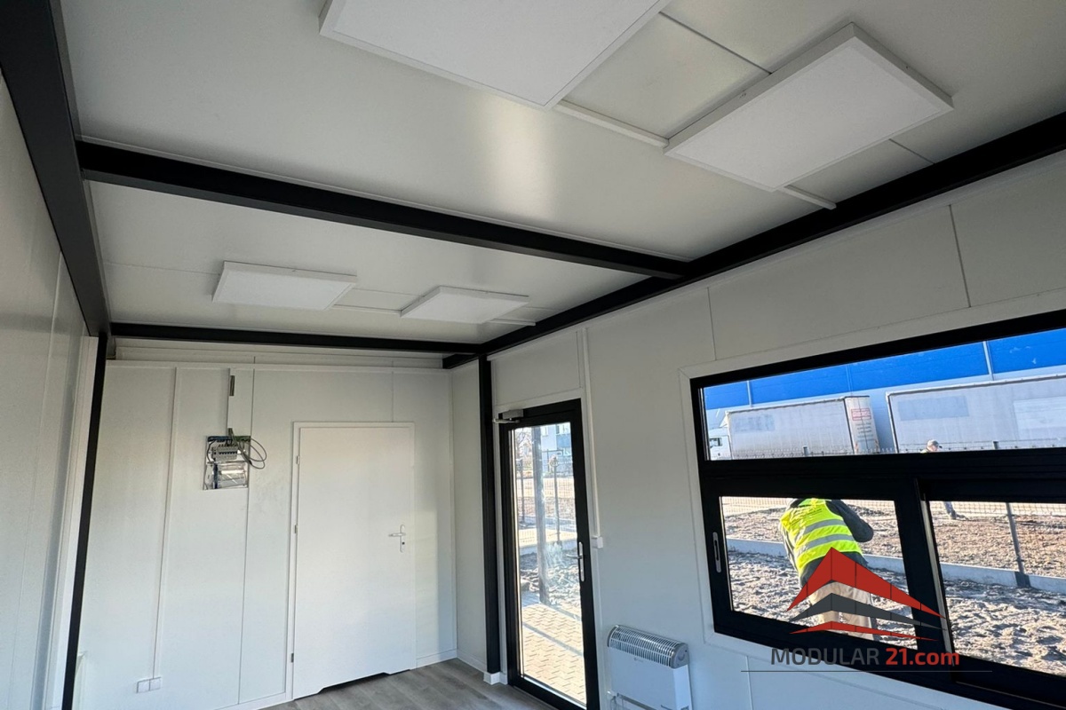Die Pförtnerloge wurde in Sandwichpaneel-Bauweise ausgeführt, was eine sehr gute Wärmedämmung, hohe Stabilität und Langlebigkeit gewährleistet. Die solide Stahlkonstruktion in Verbindung mit der hochwertigen Dämmung garantiert eine langfristige und zuverlässige Nutzung des Objekts.