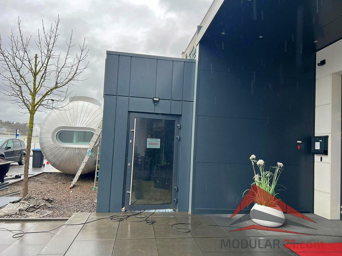 Der realisierte Empfangscontainer bietet eine praktische und moderne Lösung für den Empfang von Kunden, Besuchern oder Geschäftspartnern. Als Empfangspavillon eignet er sich ideal für Firmengelände, Verkaufsflächen oder öffentliche Einrichtungen. Dank der modularen Bauweise kann der Container schnell aufgestellt und flexibel an verschiedene Standorte angepasst werden.