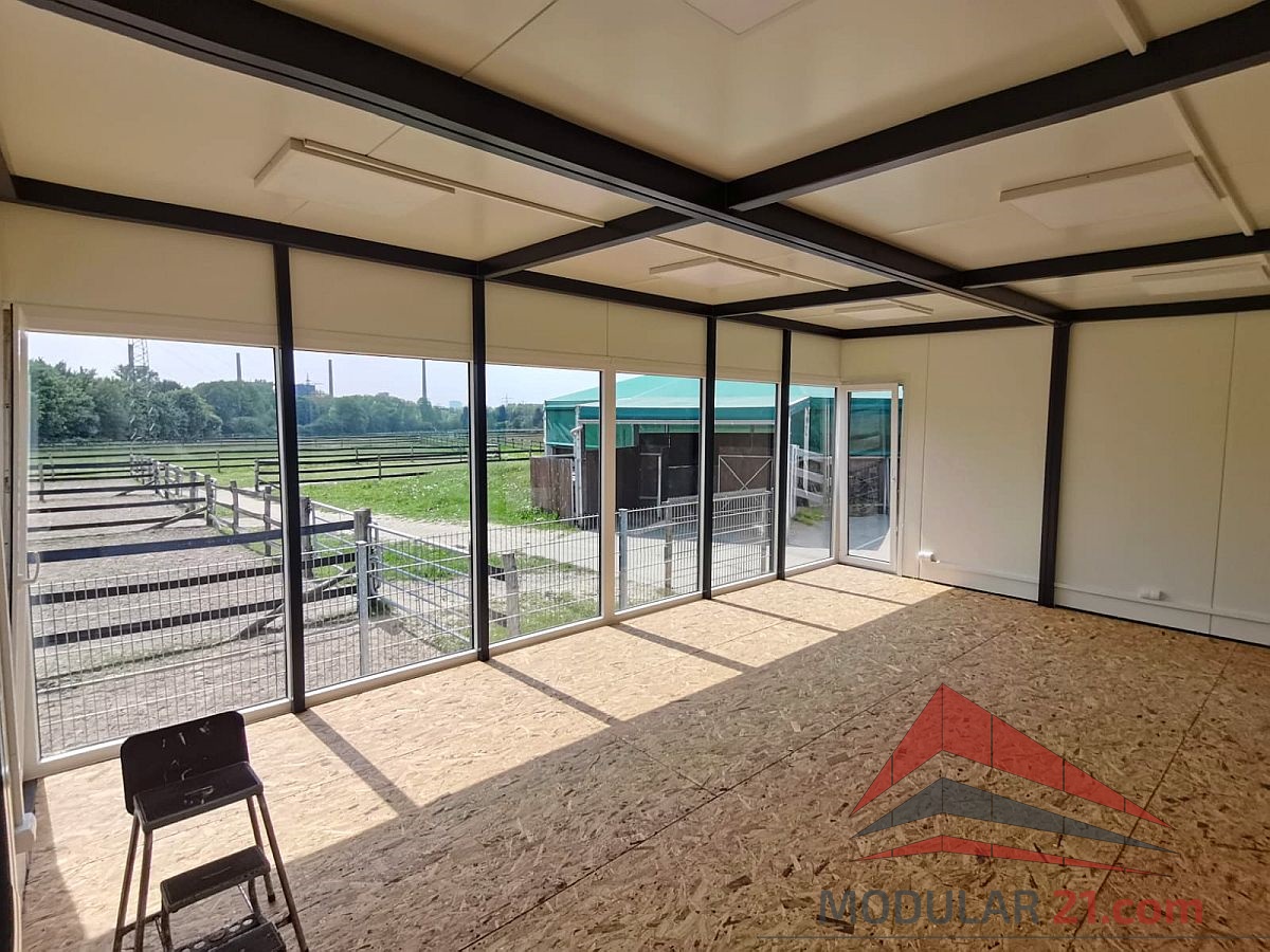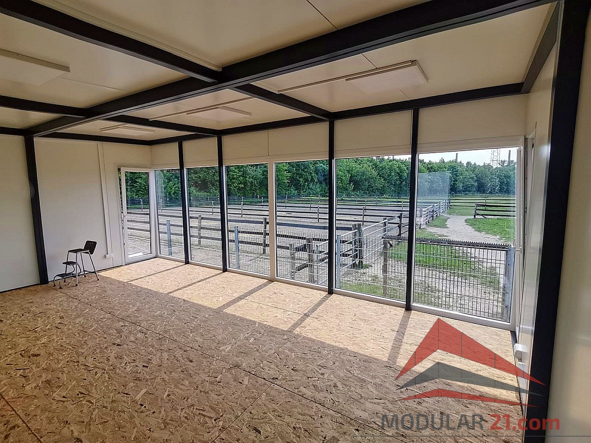 Unsere speziell für Pferderennbahnen gebauten Beobachtungscontainer bieten ein unvergleichliches Erlebnis mit einer vollständig verglasten Frontwand, die einen Panoramablick auf die gesamte Rennbahn ermöglicht. Das Innere des Containers ist geräumig und bietet bequeme Sitzgelegenheiten, Tische und zusätzliche Einrichtungen für Beobachter. Die verglaste Wand aus hochwertigem, schadensresistentem Glas bietet eine hervorragende Sicht und schützt gleichzeitig vor Witterungseinflüssen.